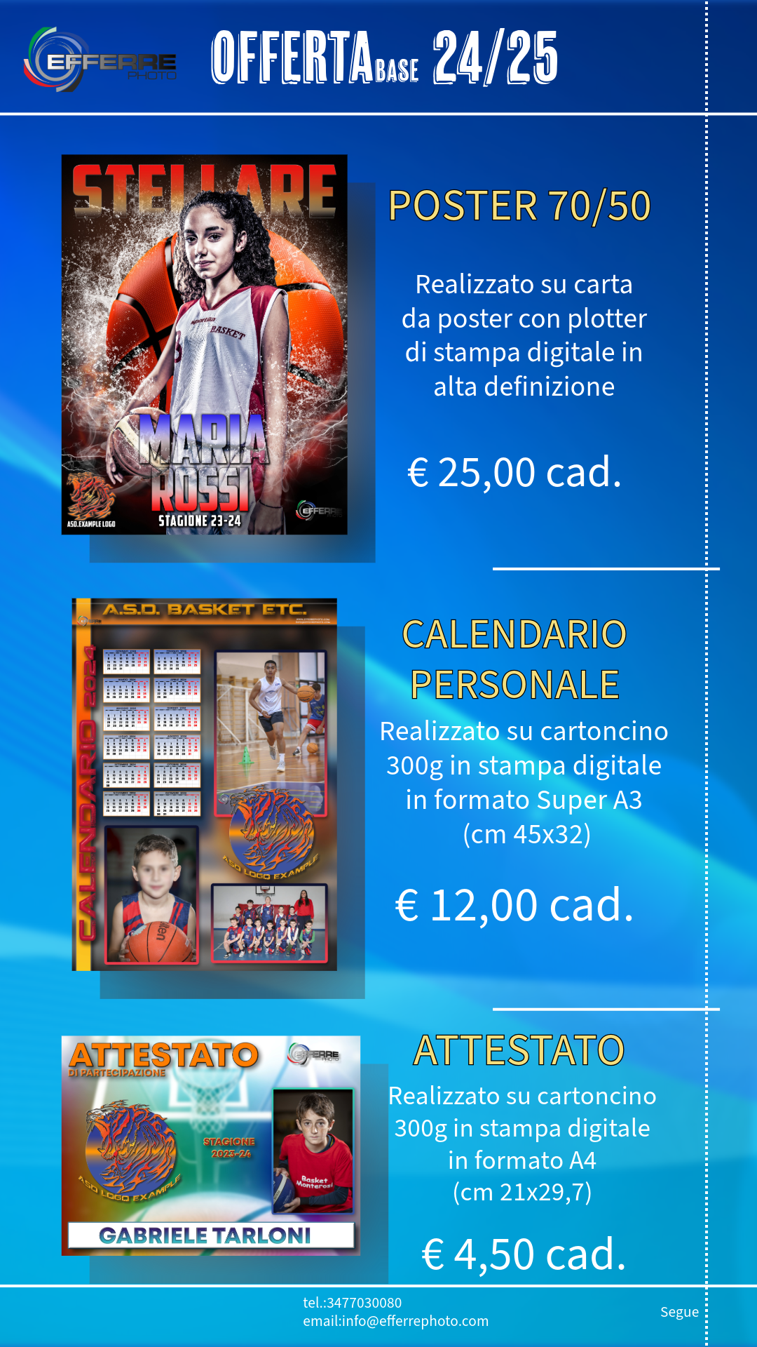 Realizziamo, con le società sportive, una PARTNERSHIP nella realizzazione di prodotti, che sicuramente renderanno visibile nell’immediato un cambio di immagine, sia nei confronti degli atleti iscritti, che con eventuali INVESTITORI che sicuramente avranno a disposizione vettori pubblicitari originali e di qualità.